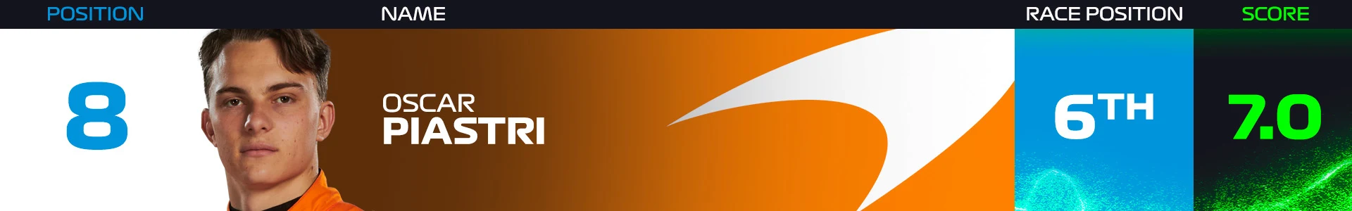 Unfortunately, he just didn't have the pace to contend in the race and lost out to his team mate Norris, Russell, and Perez. Sixth place is still a great way to end a fantastic campaign, leaving plenty excited as to what is to come in the future from the Australian.