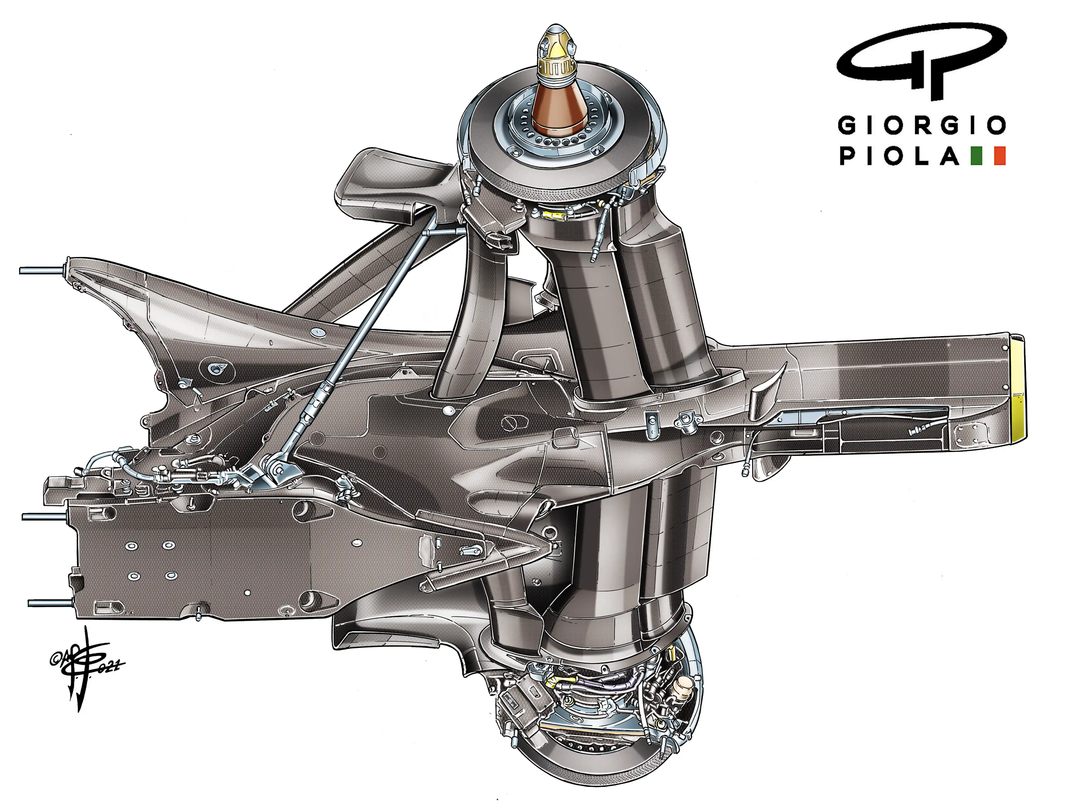 Structurally, this isn’t new; several teams – notably Williams and Red Bull – designed cars in the early 2010s with the wishbones attached to a super-strong central mount, with the wing support running around it. But they were not mounted anywhere near as high as this.